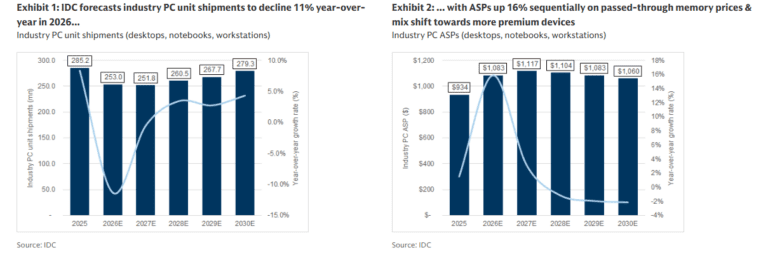 The charts above show IDC’s forecasts for the PC industry from 2025 to 2030, focusing on PC unit shipments and average selling prices.