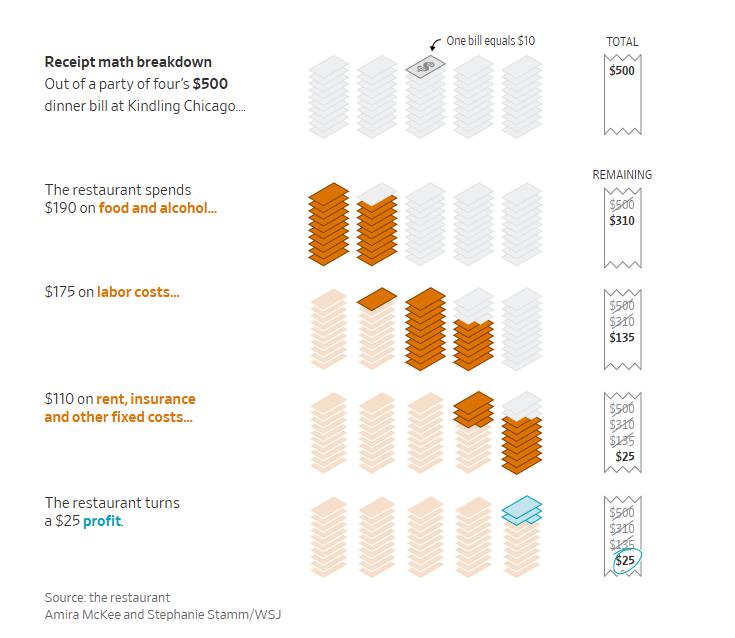 The chart above shows how a $500 bill at the Chicago restaurant, Kindling, is distributed. After all operating expenses are paid, the restaurant is left with only $25 profit.