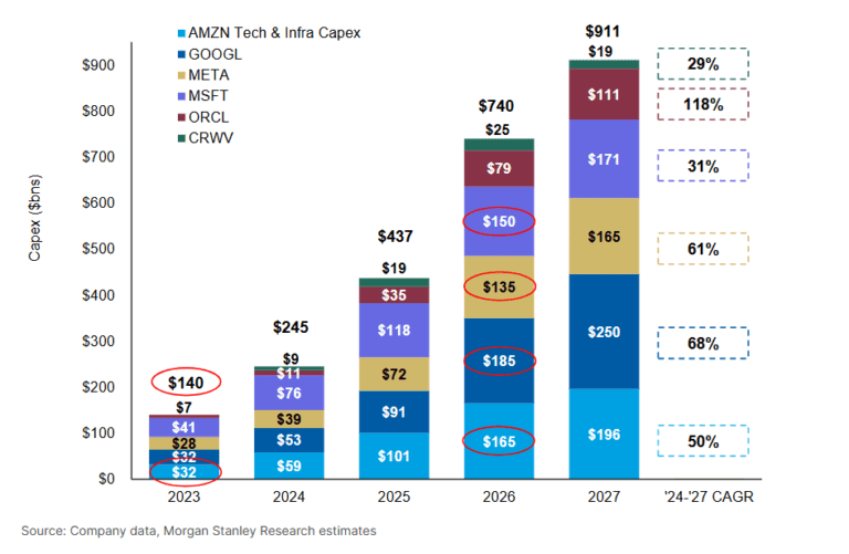 The chart above shows Morgan Stanley estimates of future cap-ex expectations for the largest U.S. Hyperscalers.