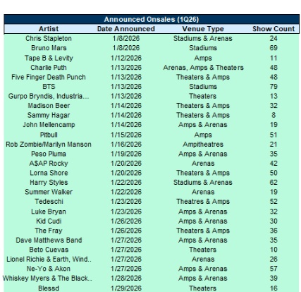 There have been 27 new concert tours announced in January 2026 vs. 7 new concert tours announced in January 2025.