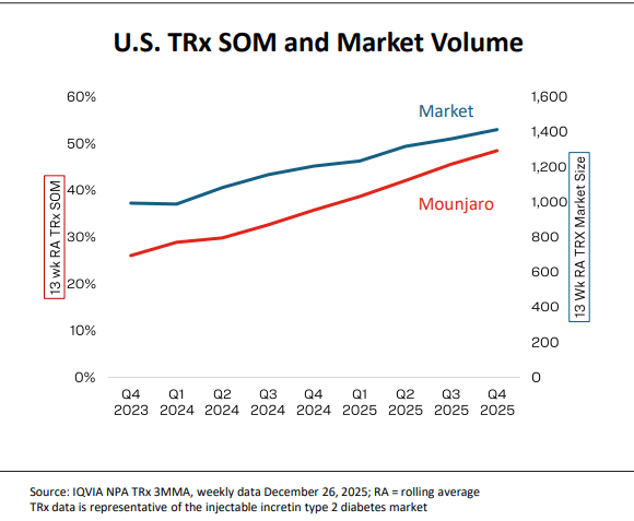 The GLP-1 obesity market continues to grow at a rapid pace, with Lily’s Mounjaro accelerating share gains from competitors to make up 45-50% of total U.S. prescription volume.