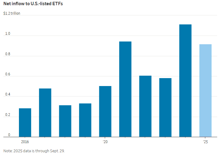 The chart above shows the net inflow of capital being invested into U.S.-listed ETFs from 2016 to 2025, indicating an upward trend.