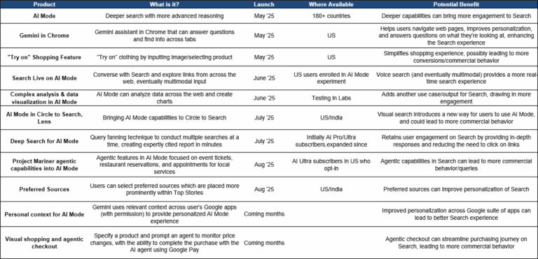 The chart above highlights a series of new Google AI-powered products and features launching throughout 2025, showing Google’s move toward more AI agents.